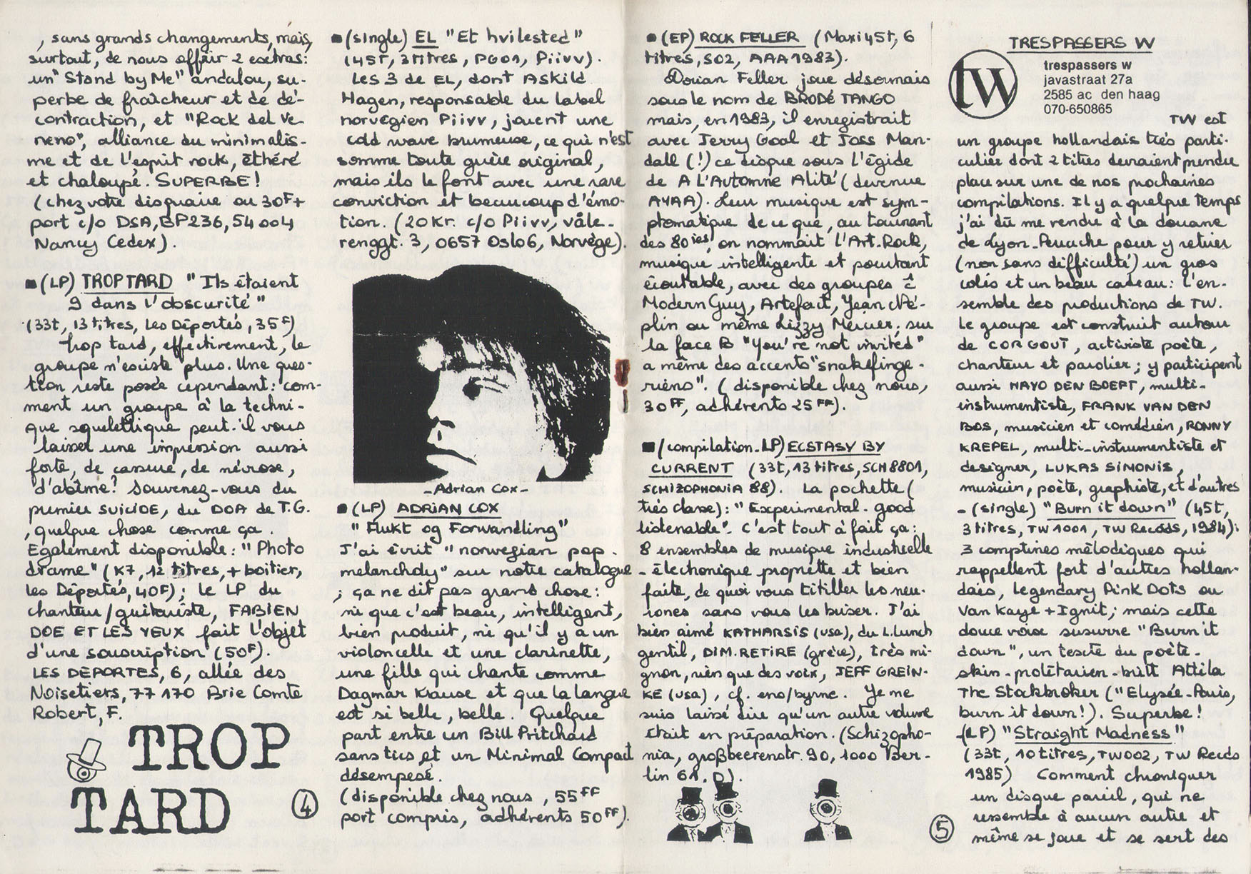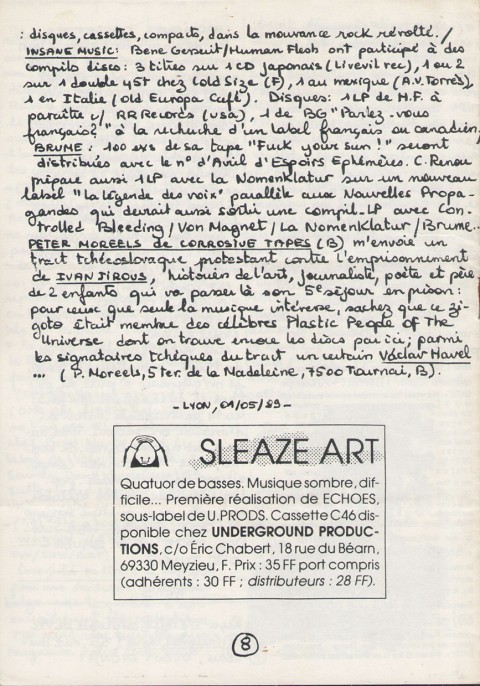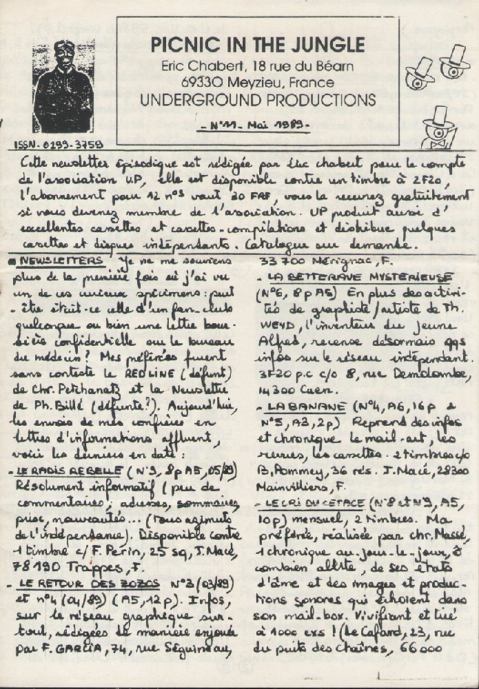 A5 8 pages → Photocopie NB ↪ FR ↪ 69 ↪ Meyzieu Parution en mai 1989Picnic In The Jungle n°11 Numerisation : Oui (300 dpi) Collection privée PLUS MOINS