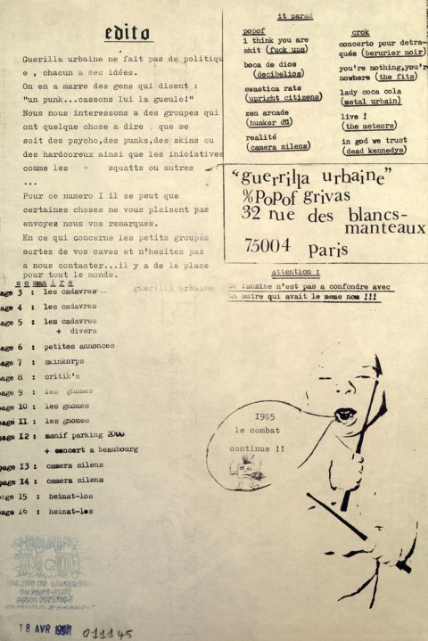 A4 18 pages → Photocopie NB ↪ FR ↪ Paris Parution en juin 1985Guerilla Urbaine n°1 Numerisation : Oui (150 dpi) En ligne sur Fanzinothèque.fr PLUS MOINS