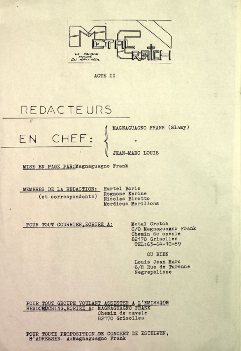 A4 64 pages → Photocopie NB ↪ FR ↪ 82 ↪ Montauban Parution en septembre 1988Metal Cratch n°2 Numerisation : Oui (150 dpi) En ligne sur Fanzinothèque.fr PLUS MOINS