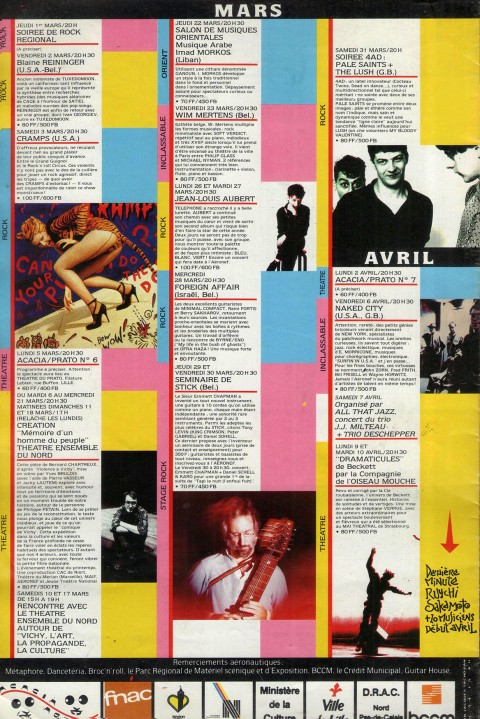 A4 8 pages → Offset ↪ FR ↪ 59 ↪ Lille Parution en janvier 1990Programme Janvier Avril par : El Rotringo Numerisation : Oui (300 dpi) Collection privée PLUS MOINS