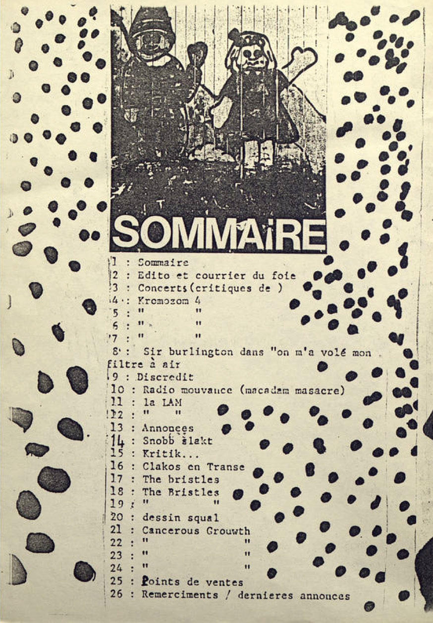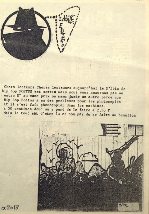 A5 28 pages → Photocopie NB ↪ FR ↪ Paris Parution en 1985Bip Bop Foetus n°1 bis Numerisation : Oui (150 dpi) En ligne sur Fanzinothèque.fr PLUS MOINS