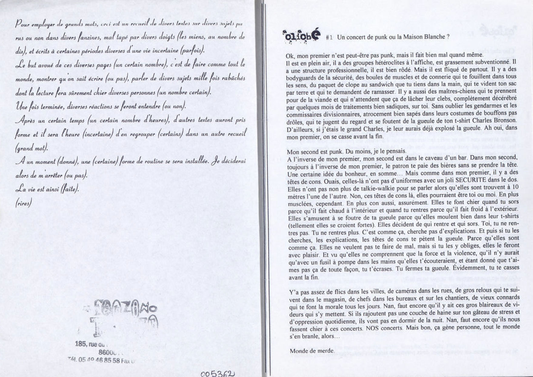 A5 20 pages → Photocopie NB ↪ FR ↪ 57 ↪ Metz Parution en 2001Cliché n°1 Numerisation : Oui (150 dpi) En ligne sur Fanzinothèque.fr PLUS MOINS