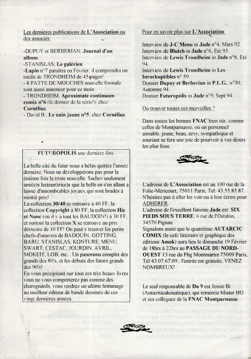 A5 4 pages → Photocopie NB ↪ FR ↪ Paris Parution en fevrier 1995Du 9 n°1 Numerisation : Oui (300 dpi) Collection Fanzinothèque de Poitiers PLUS MOINS
