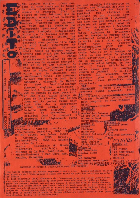 A4 24 pages → Photocopie NB ↪ FR ↪ 33 ↪ Bordeaux Parution en septembre 1993Goorgh n°15 Numerisation : Oui (150 dpi) En ligne sur *Fanzinothèque.fr* PLUS MOINS