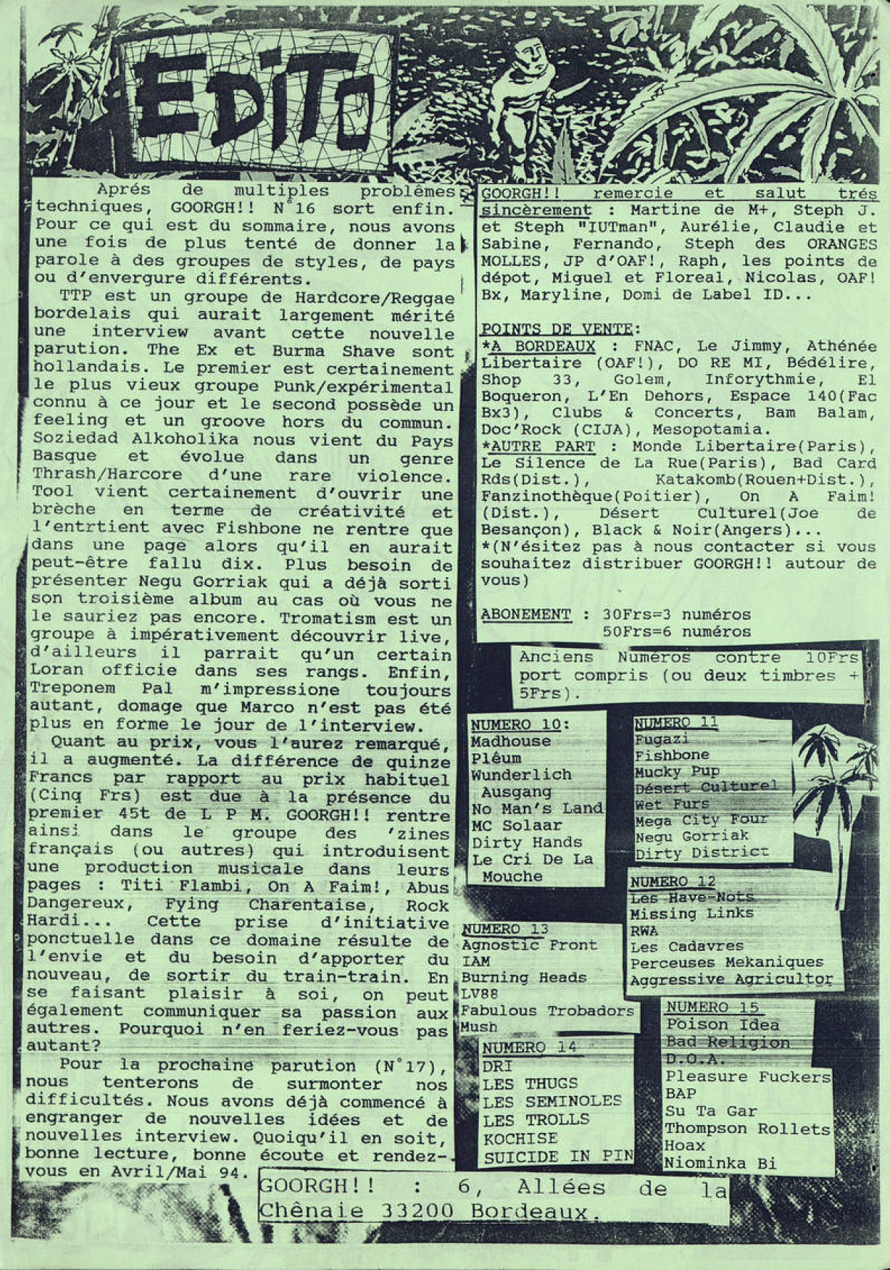A4 26 pages → Photocopie NB ↪ FR ↪ 33 ↪ Bordeaux Parution en novembre 1993Goorgh n°16 Numerisation : Oui (150 dpi) En ligne sur Fanzinothèque.fr PLUS MOINS