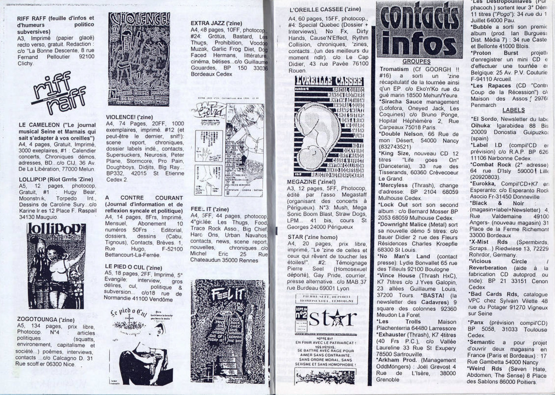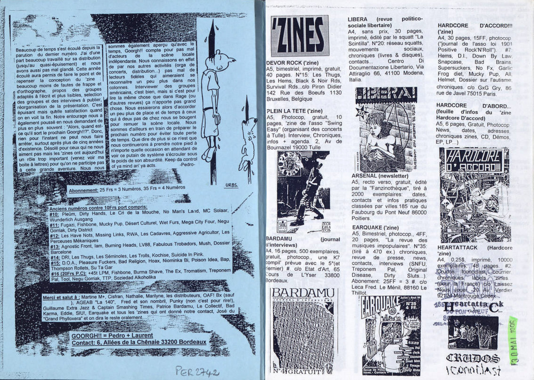 A5 36 pages → Photocopie NB ↪ FR ↪ 33 ↪ Bordeaux Parution en octobre 1994Goorgh n°17 Numerisation : Oui (150 dpi) En ligne sur Fanzinothèque.fr PLUS MOINS