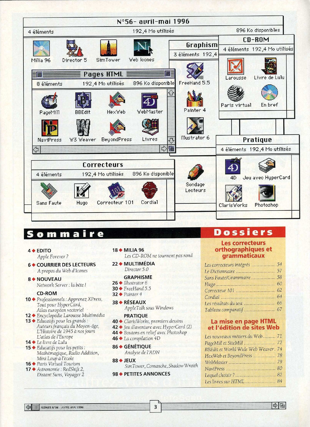 A4 100 pages → Offset ↪ FR ↪ 59 ↪ Lille Parution en avril 1996Icônes n°56 Numerisation : Oui (150 dpi) En ligne sur archive.org PLUS MOINS
