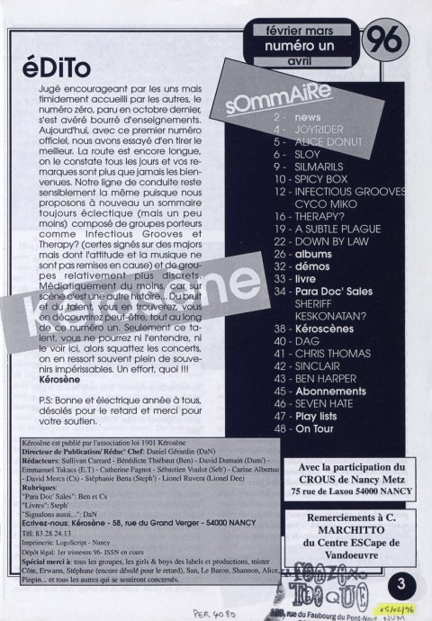 A4 48 pages → Offset ↪ FR ↪ 54 ↪ Nancy Parution en fevrier 1996Kerosene n°1 Numerisation : Oui (150 dpi) En ligne sur Fanzinothèque.fr PLUS MOINS
