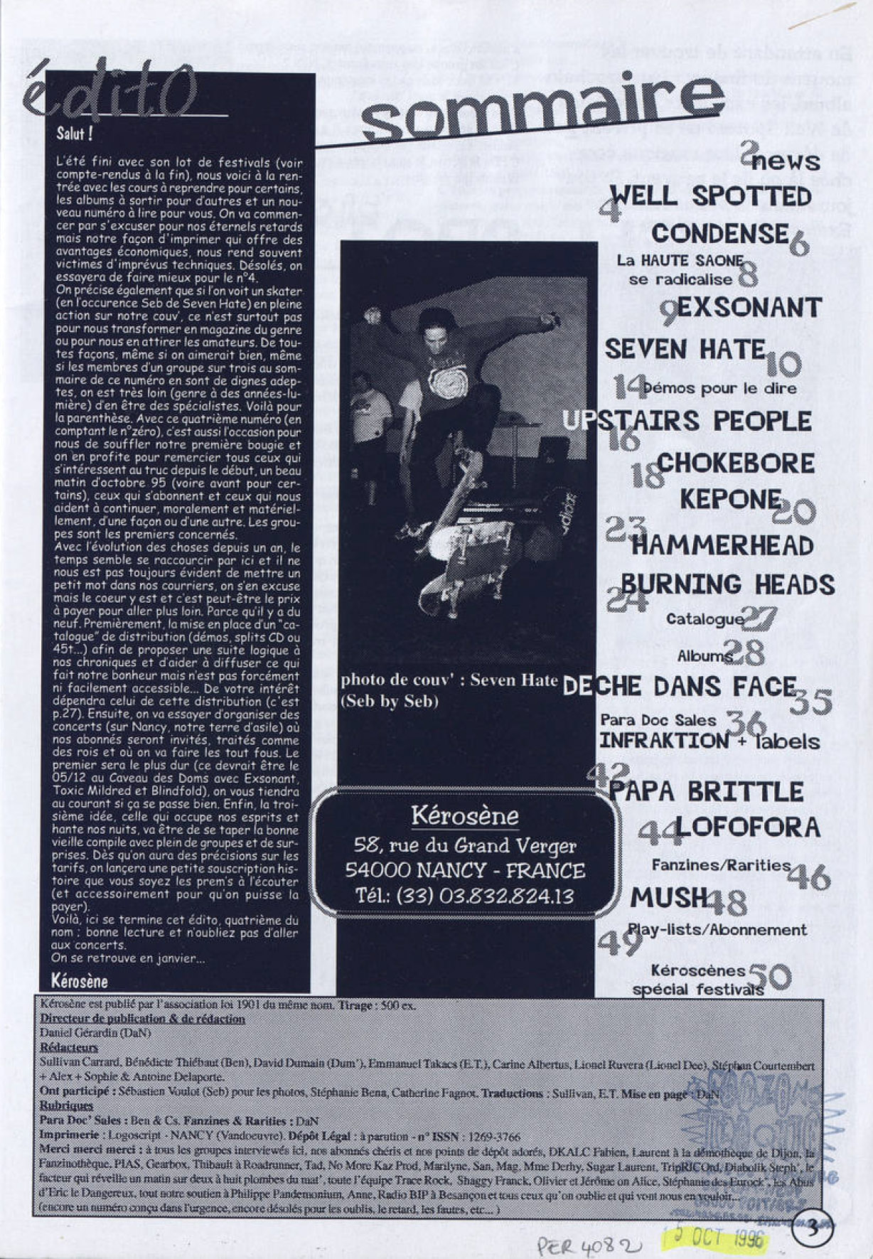 A4 52 pages → Offset ↪ FR ↪ 54 ↪ Nancy Parution en octobre 1996Kerosene n°3 Numerisation : Oui (150 dpi) En ligne sur Fanzinothèque.fr PLUS MOINS