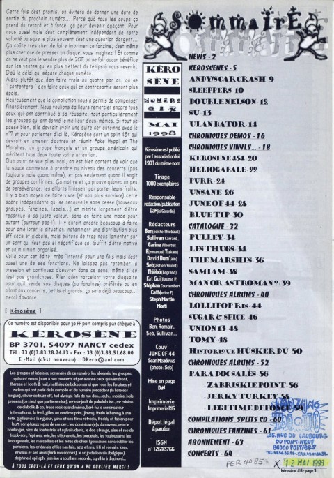 A4 64 pages → Offset ↪ FR ↪ 54 ↪ Nancy Parution en mai 1998Kerosene n°6 Numerisation : Oui (150 dpi) En ligne sur Fanzinothèque.fr PLUS MOINS