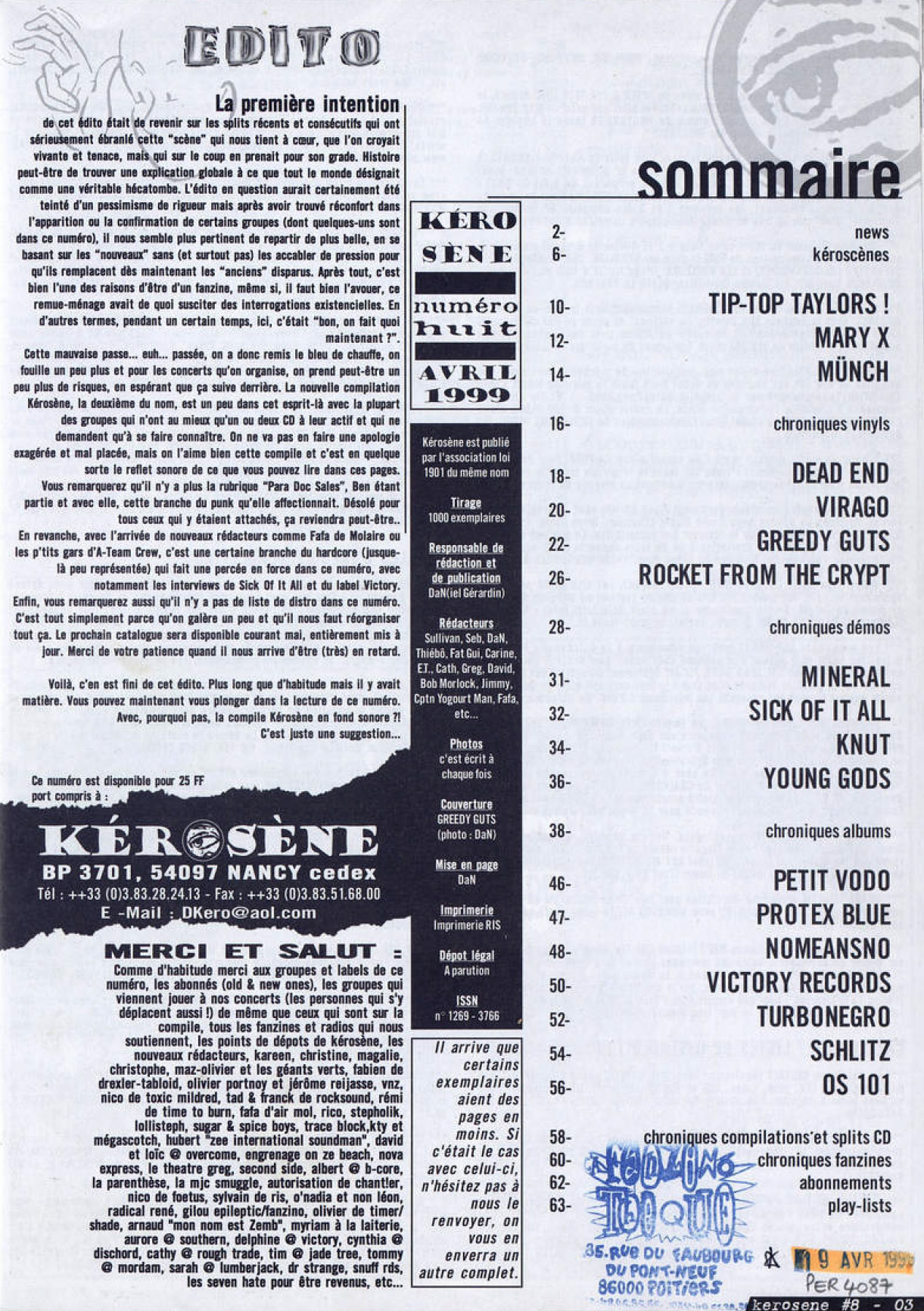 A4 64 pages → Offset ↪ FR ↪ 54 ↪ Nancy Parution en mai 1999Kerosene n°8 Numerisation : Oui (150 dpi) En ligne sur Fanzinothèque.fr PLUS MOINS