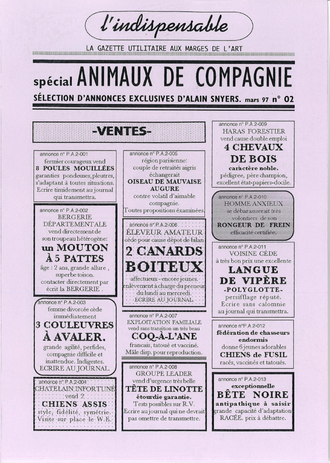 A4 4 pages → Photocopie NB ↪ FR ↪ Paris Parution en mars 1997L'indispensable n°2 Numerisation : Oui (150 dpi) En ligne sur Fanzinothèque.fr PLUS MOINS