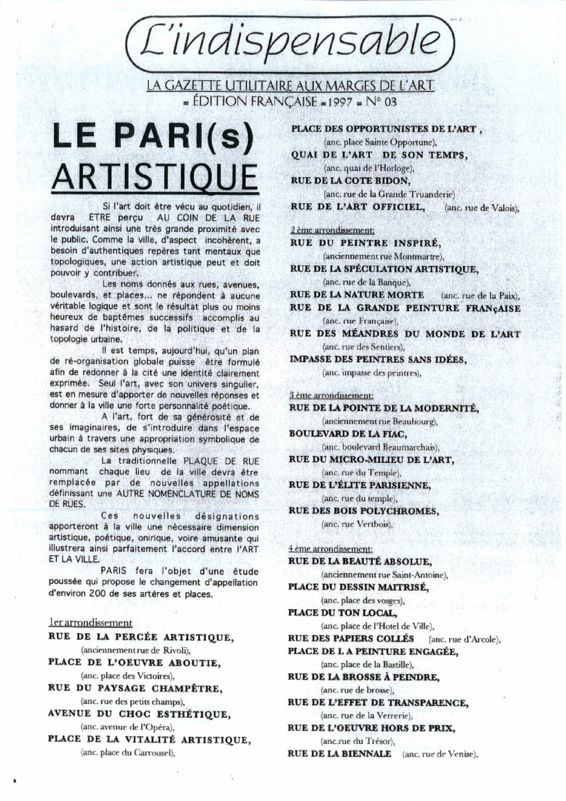 A4 4 pages → Photocopie NB ↪ FR ↪ Paris Parution en juillet 1997L'indispensable n°3 Numerisation : Oui (150 dpi) En ligne sur Fanzinothèque.fr PLUS MOINS
