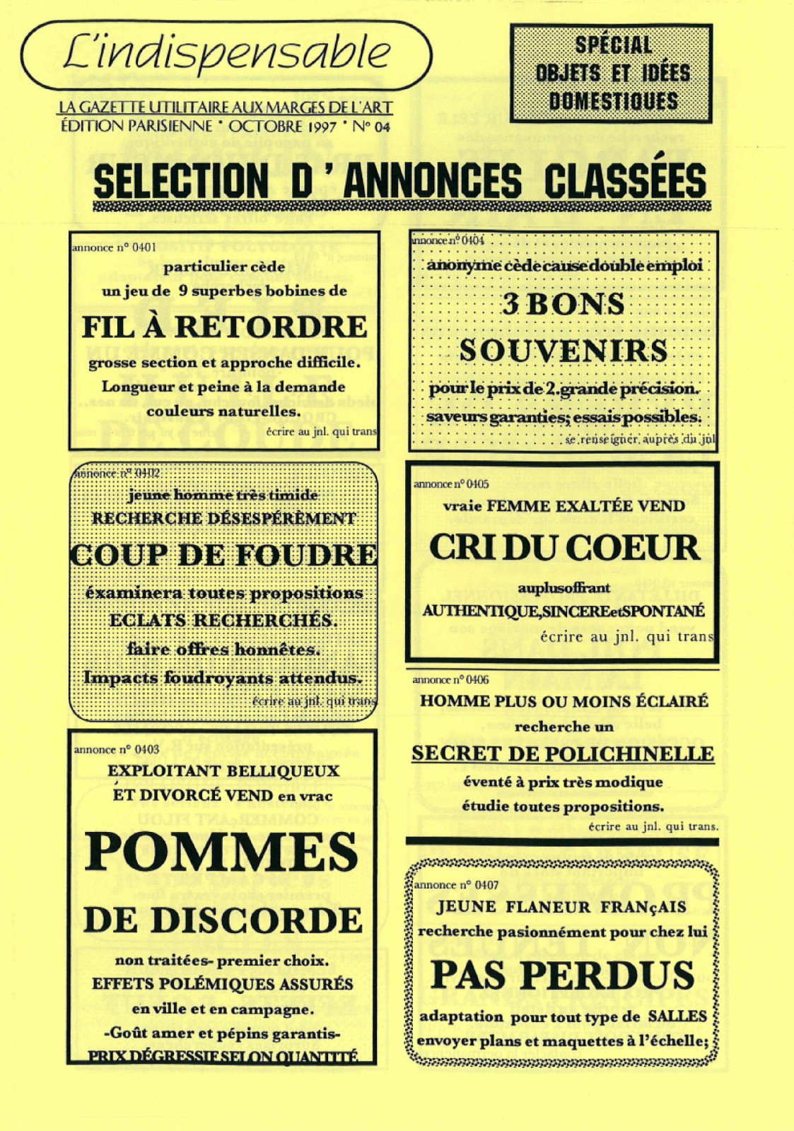 A4 4 pages → Photocopie NB ↪ FR ↪ Paris Parution en octobre 1997L'indispensable n°4 Numerisation : Oui (150 dpi) En ligne sur Fanzinothèque.fr PLUS MOINS