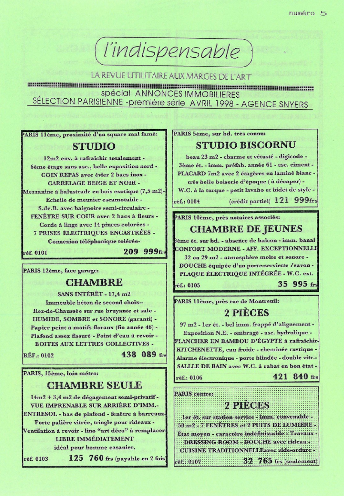 A4 4 pages → Photocopie NB ↪ FR ↪ Paris Parution en avril 1998L'indispensable n°5 Numerisation : Oui (150 dpi) En ligne sur Fanzinothèque.fr PLUS MOINS