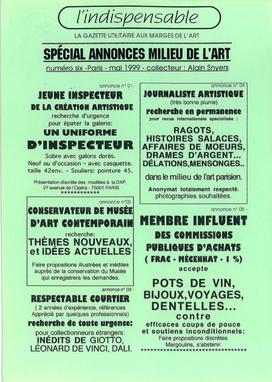A4 4 pages → Photocopie NB ↪ FR ↪ Paris Parution en mai 1999L'indispensable n°6 Numerisation : Oui (150 dpi) En ligne sur Fanzinothèque.fr PLUS MOINS