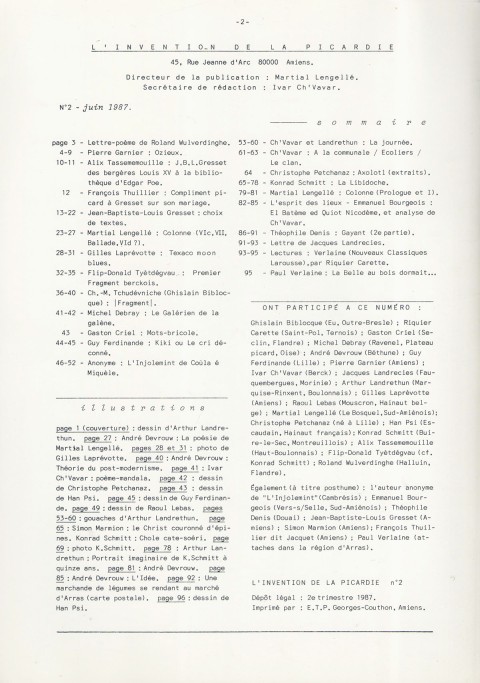 A4 → Offset ↪ FR ↪ 80 ↪ Amiens Parution en juin 1987L'invention de la Picardie n°2 Numerisation : Oui (150 dpi) Collection privée PLUS MOINS