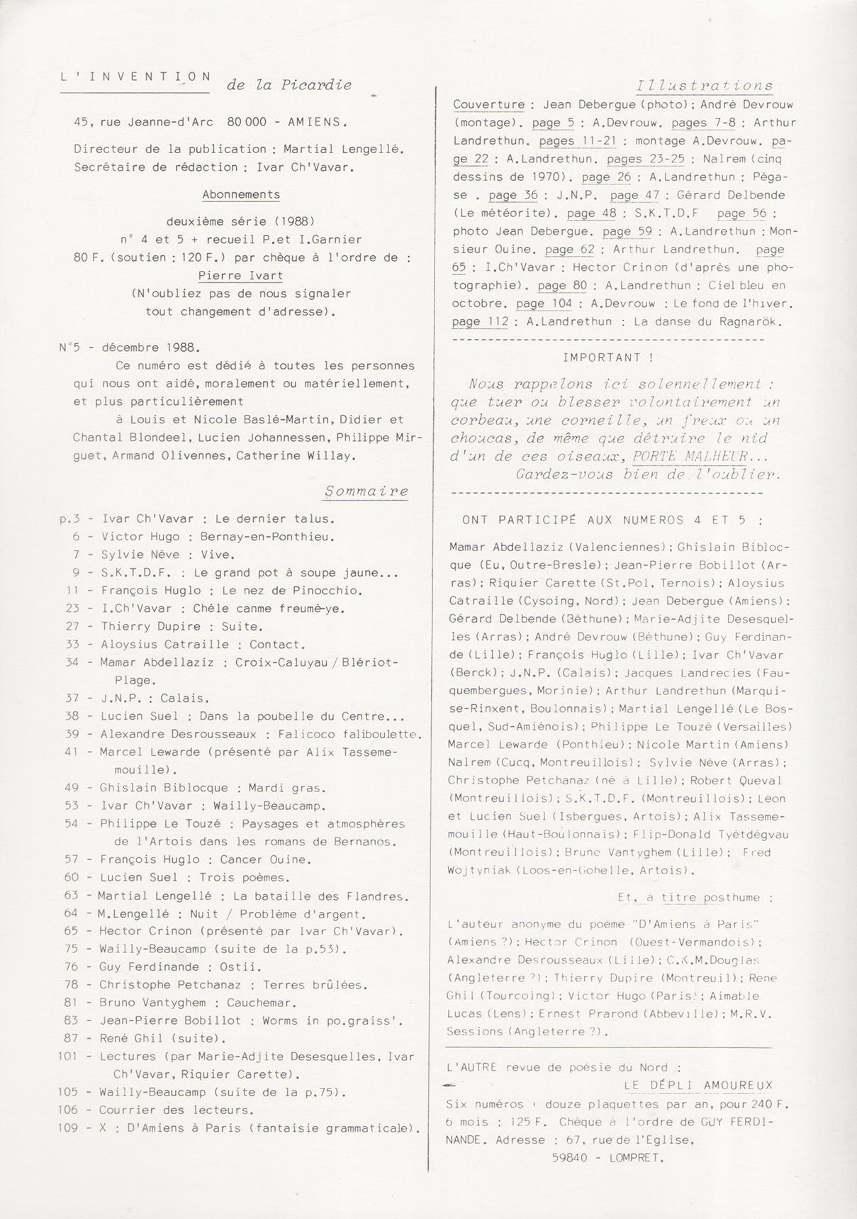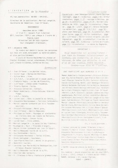 A4 → Offset ↪ FR ↪ 80 ↪ Amiens Parution en decembre 1988L'invention de la Picardie n°5 Numerisation : Oui (150 dpi) Collection privée PLUS MOINS
