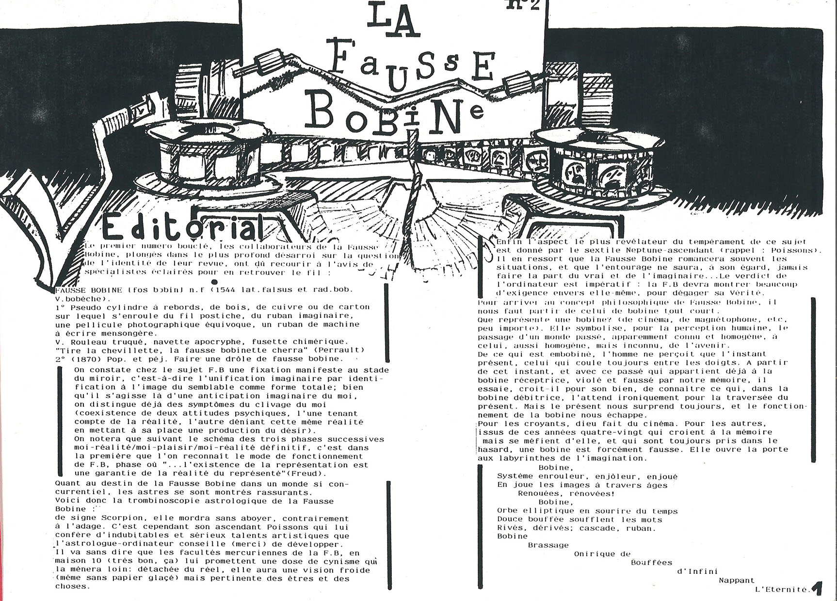 A4 30 pages → Photocopie NB ↪ FR ↪ Paris Parution en mars 1986La Fausse Bobine n°2 Numerisation : Oui (300 dpi) Collection Fanzinothèque de Poitiers PLUS MOINS