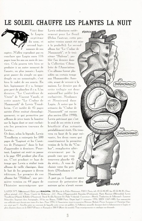 14.5 x 21.5 cm 116 pages → Offset ↪ FR ↪ Paris Parution en janvier 1995Lapin n°7 chez : Association (L') Numerisation : Oui (300 dpi) Collection privée PLUS MOINS