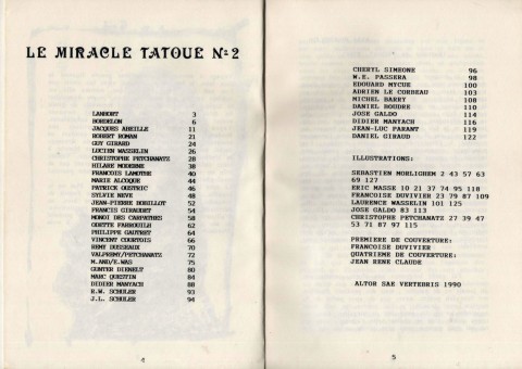 A5 128 pages → Offset ↪ FR ↪ 31 ↪ Toulouse Parution en 1990Le Miracle Tatoué n°2 Numerisation : Oui (300 dpi) Sans commentaire (pour le moment). PLUS MOINS