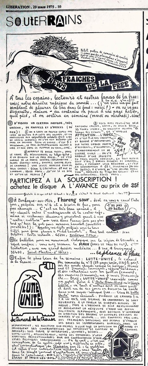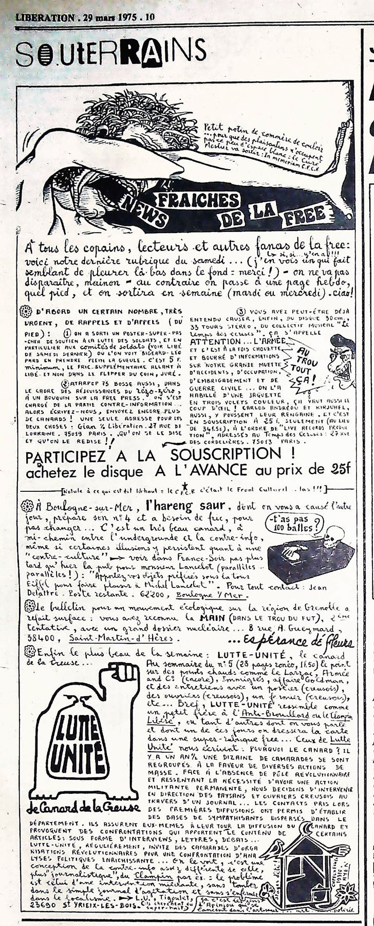 29 x 41 cm 12 pages → Offset ↪ FR Parution en mars 1975Libération n°395 chez : Libération Numerisation : Oui (150 dpi) Collection privée PLUS MOINS