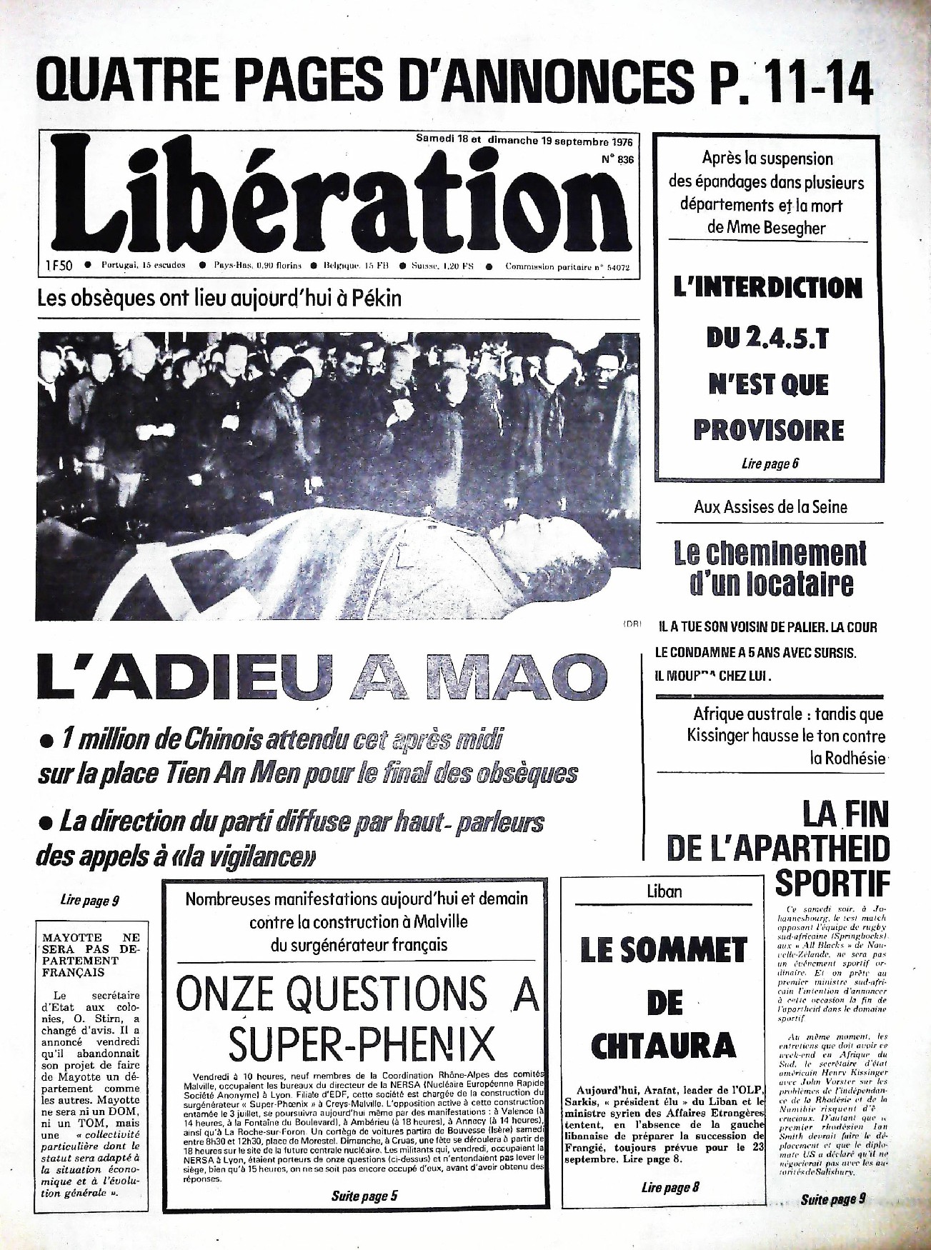 29 x 41 cm 16 pages → Offset ↪ FR Parution en septembre 1976Libération n°836 chez : Libération Numerisation : Oui (150 dpi) Collection privée PLUS MOINS