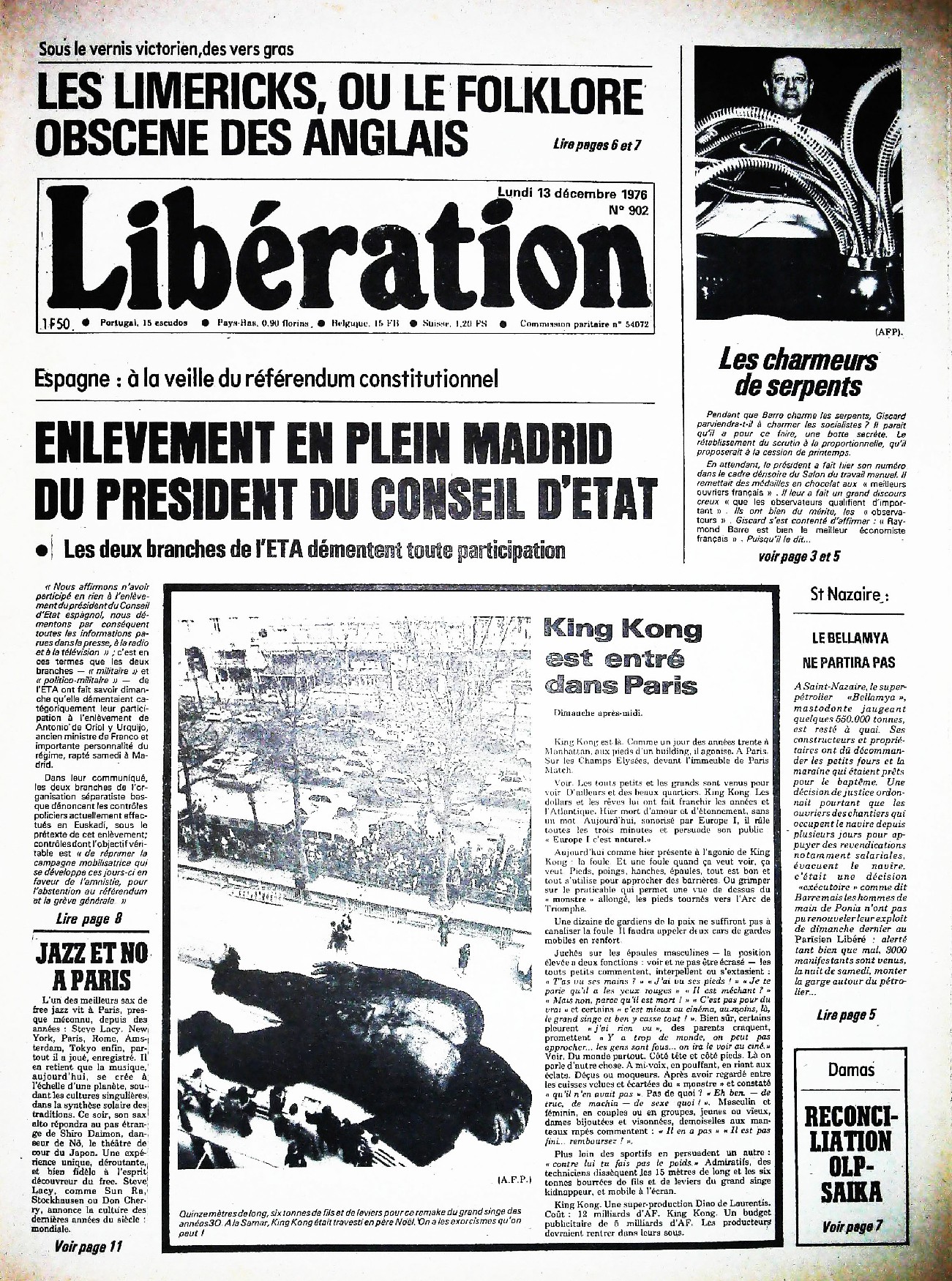 29 x 41 cm 12 pages → Offset ↪ FR Parution en decembre 1976Libération n°902 chez : Libération Numerisation : Oui (150 dpi) Collection privée PLUS MOINS