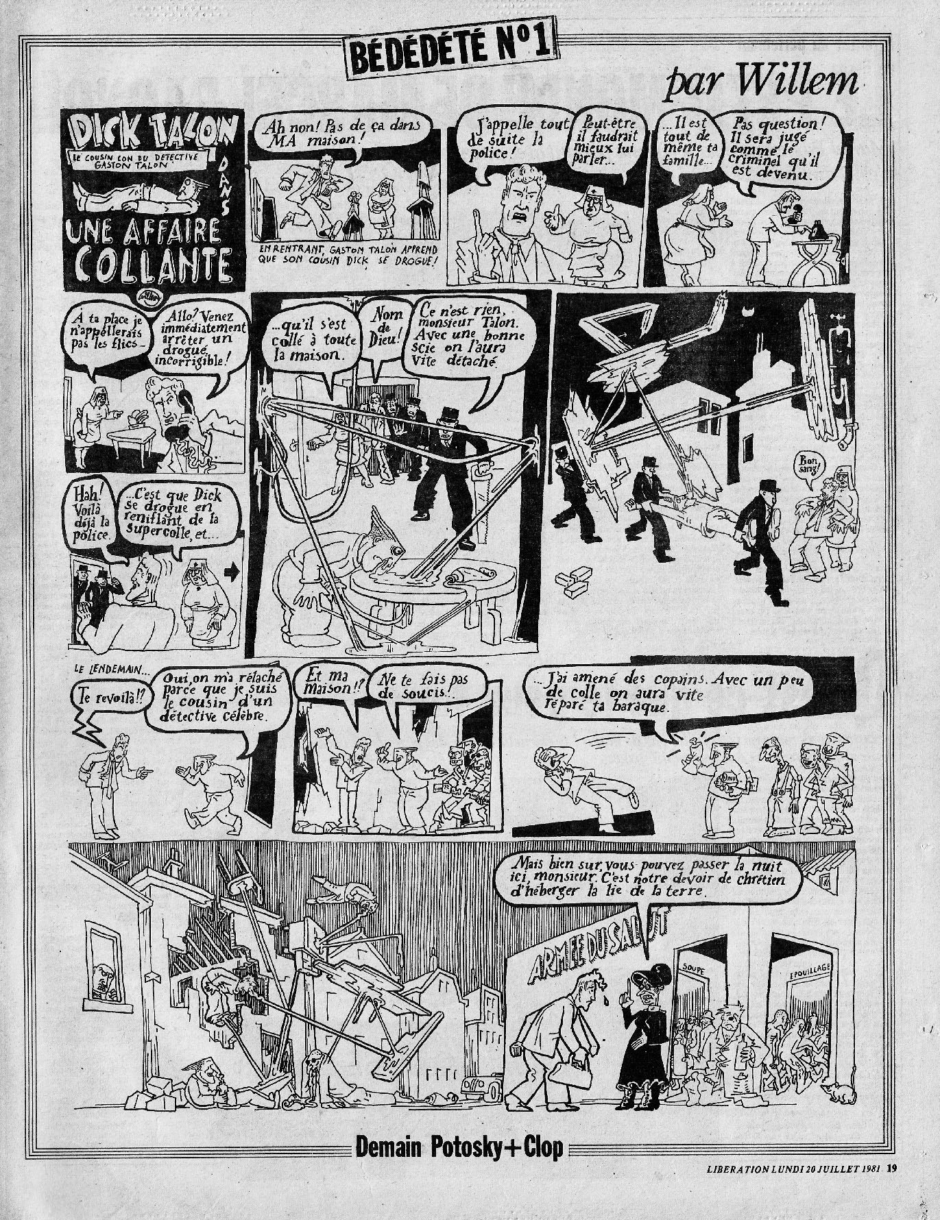 28 x 36 cm → Offset ↪ FR Parution en juillet 1981Libération (Bédé d'été 1 Willem) par : Willem Numerisation : Oui (300 dpi) Collection privée PLUS MOINS