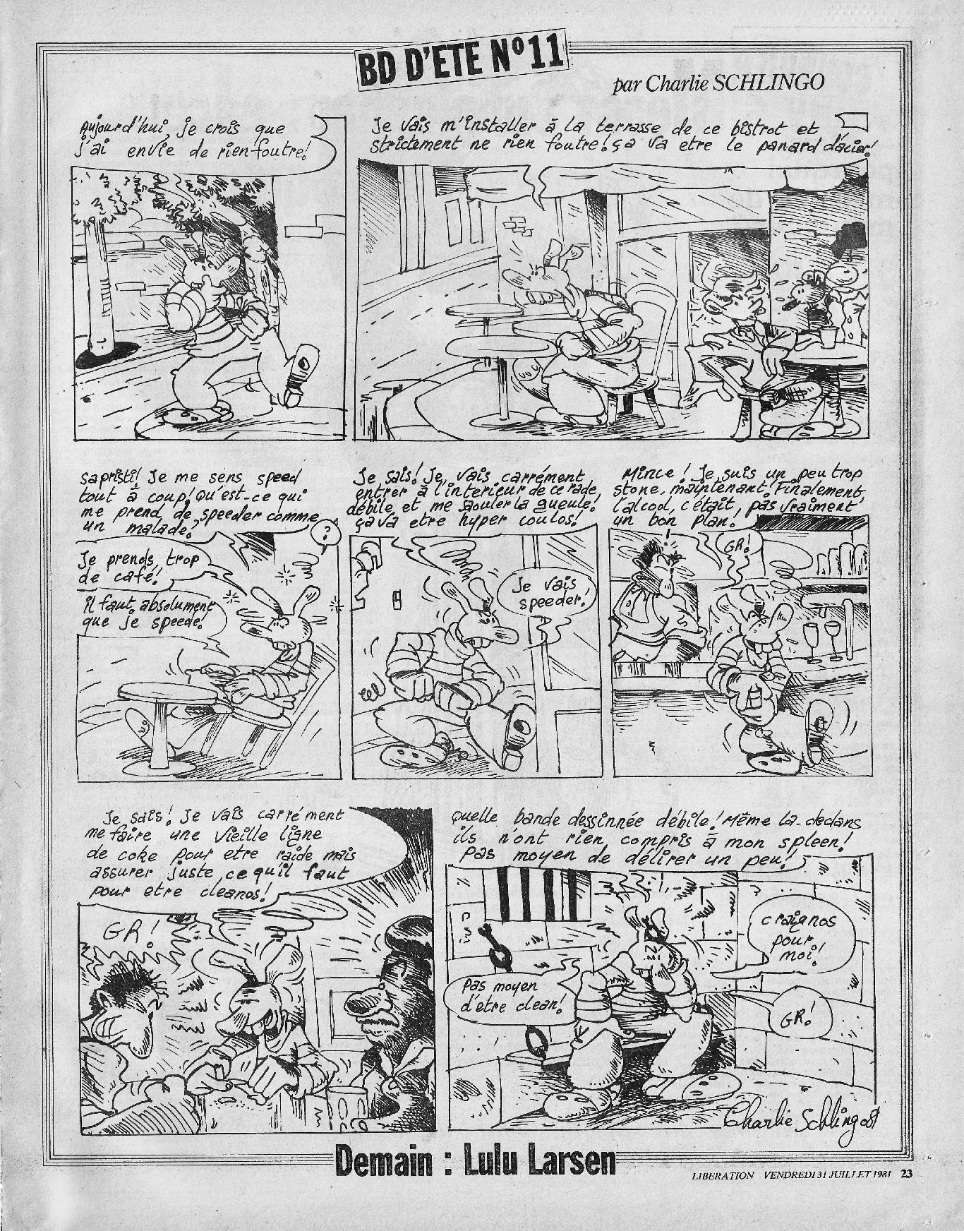 28 x 36 cm → Offset ↪ FR Parution en juillet 1981Libération (Bédé d'été 11 Schlingo) par : Schlingo (Charlie) chez : Libération Numerisation : Oui (300 dpi) Collection privée PLUS MOINS