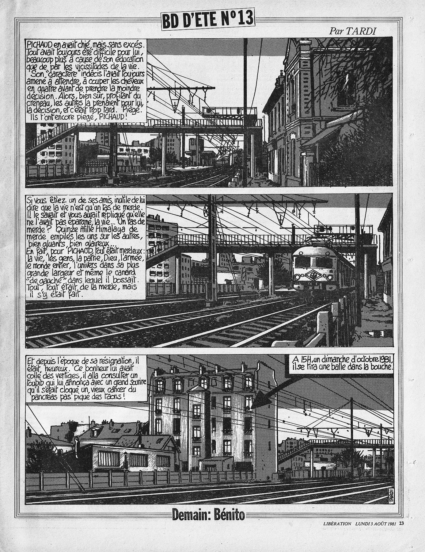 28 x 36 cm → Offset ↪ FR Parution en aout 1981Libération (Bédé d'été 13 Tardi) chez : Libération Numerisation : Oui (300 dpi) Collection privée PLUS MOINS