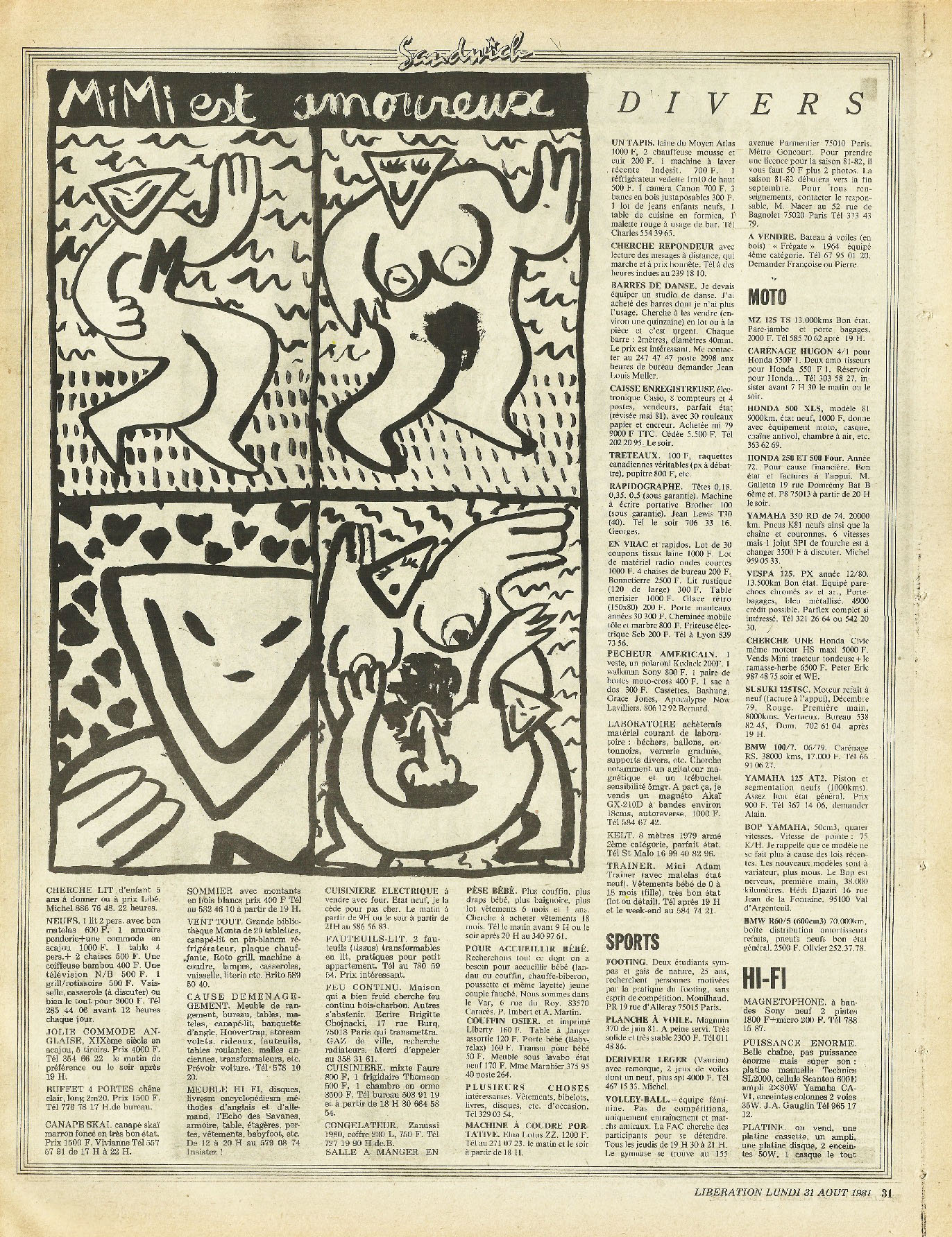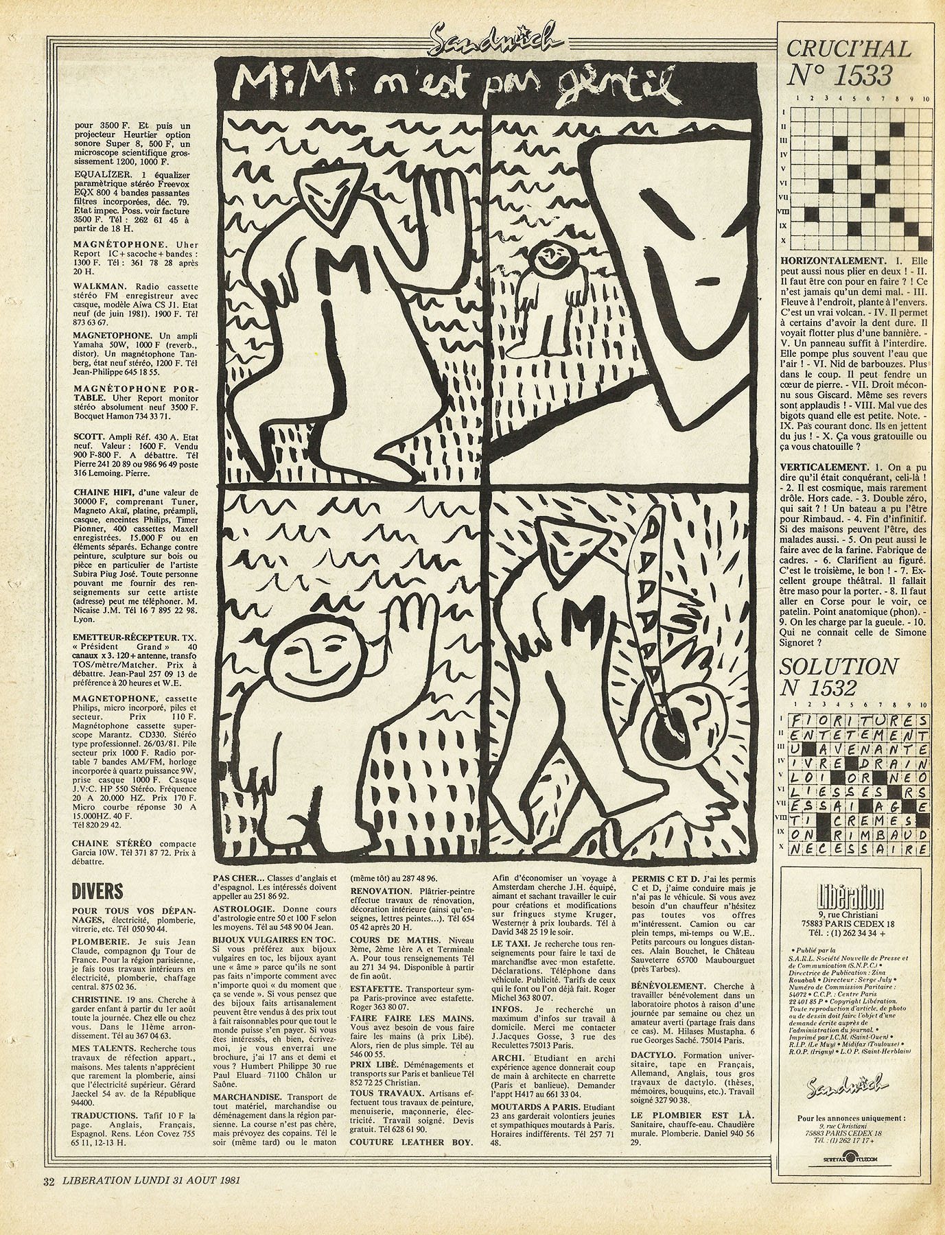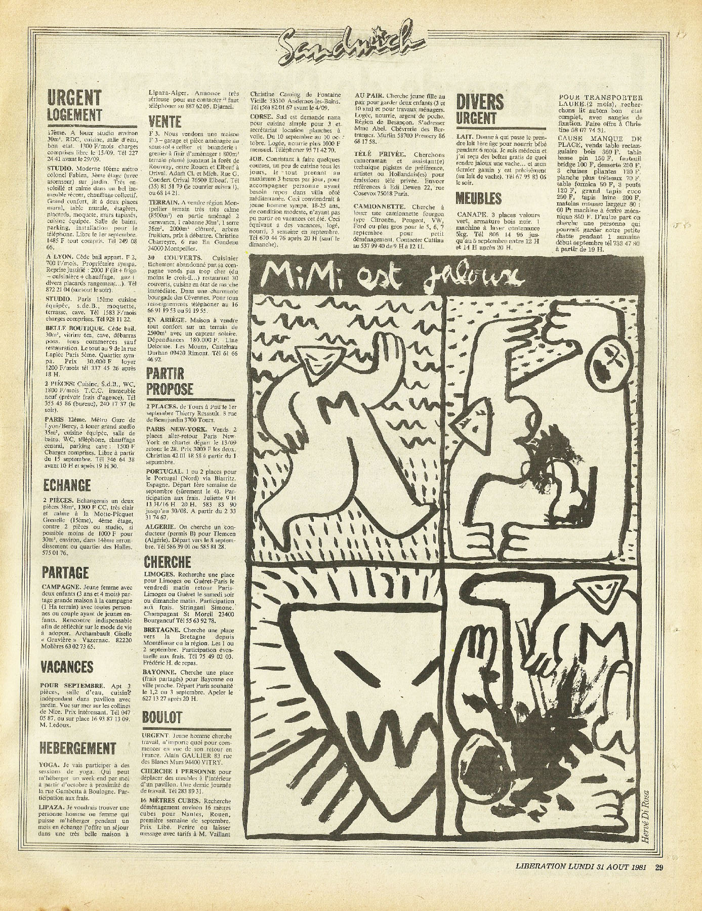 28 x 36 cm 3 pages → Offset ↪ FR Parution en aout 1981Libération (Di Rosa) par : Di Rosa (Hervé) chez : Libération Numerisation : Oui (300 dpi) Collection privée PLUS MOINS