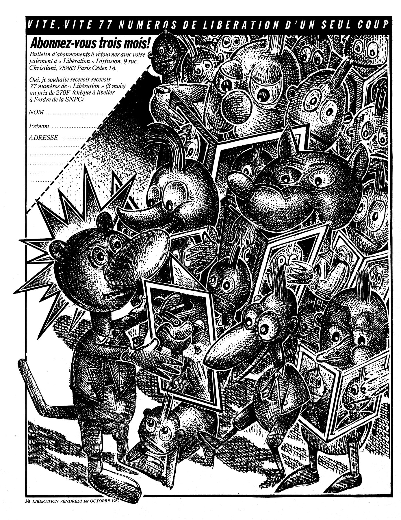 28 x 36 cm 1 pages → Offset ↪ FR Parution en octobre 1982Libération (Doury) par : Doury (Pascal) chez : Libération Numerisation : Oui (300 dpi) Collection privée PLUS MOINS