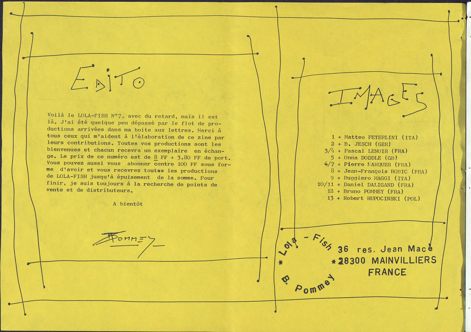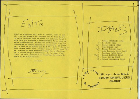 A5 20 pages → Photocopie NB ↪ FR ↪ 28 ↪ Mainvilliers Parution en octobre 1990Lola Fish n°7 Auto édition Numerisation : Oui (300 dpi) En ligne sur Fanzinothèque.fr PLUS MOINS
