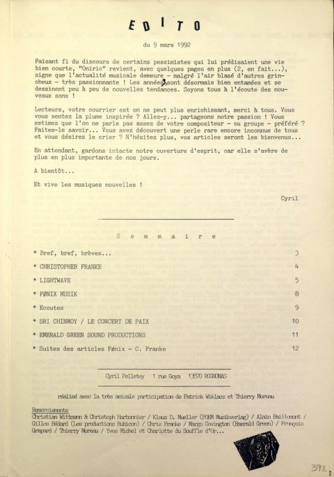 A4 24 pages → Photocopie NB ↪ FR ↪ 13 ↪ Rognonas Parution en mars 1992Oniric n°3 Numerisation : Oui (150 dpi) En ligne sur Fanzinothèque.fr PLUS MOINS