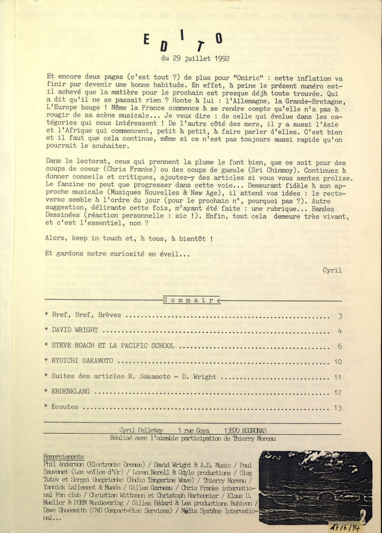 A4 28 pages → Photocopie NB ↪ FR ↪ 13 ↪ Rognonas Parution en juillet 1992Oniric n°4 Numerisation : Oui (150 dpi) En ligne sur Fanzinothèque.fr PLUS MOINS
