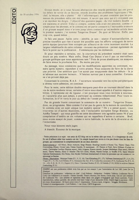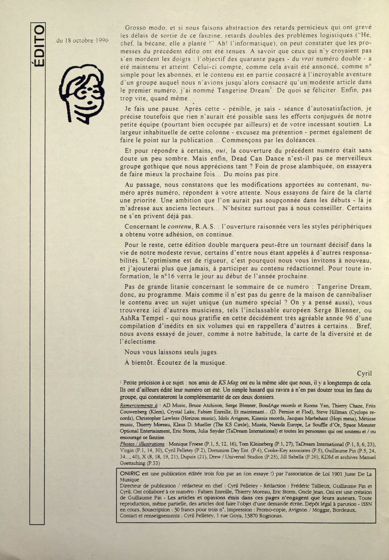 A4 40 pages → Photocopie NB ↪ FR ↪ 13 ↪ Rognonas Parution en octobre 1996Oniric n°14-15 Numerisation : Oui (150 dpi) En ligne sur Fanzinothèque.fr PLUS MOINS