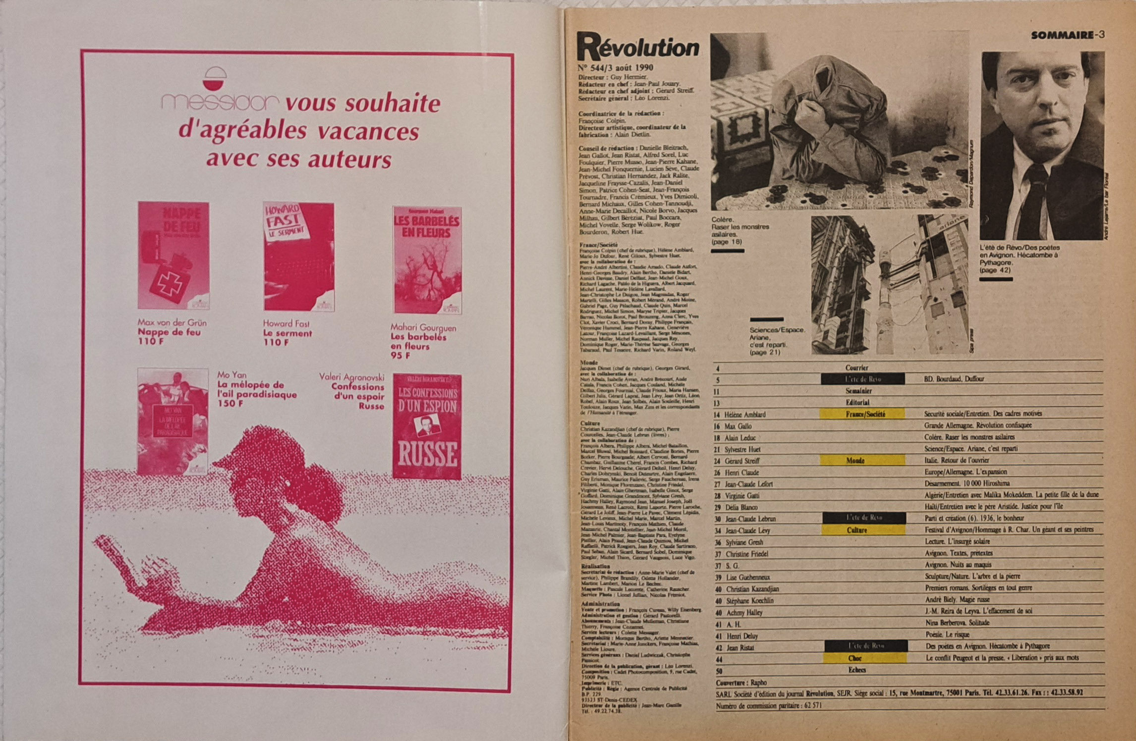 A4 23 x 32 cm 52 pages → Offset ↪ FR ↪ Paris Parution en aout 1990Révolution n°544 Numerisation : Oui (150 dpi) Collection privée PLUS MOINS