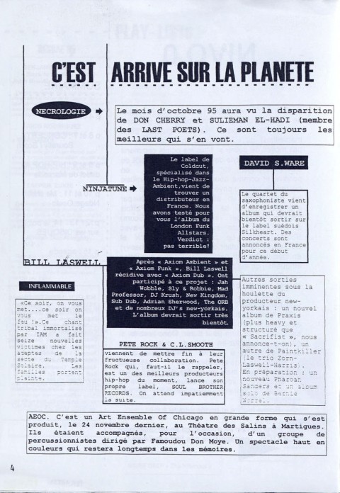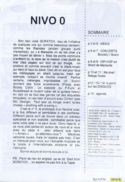 A4 16 pages → Photocopie NB ↪ FR ↪ 13 ↪ Marseille Parution en fevrier 1996Scratch n°0 Numerisation : Oui (150 dpi) En ligne sur Fanzinothèque.fr PLUS MOINS