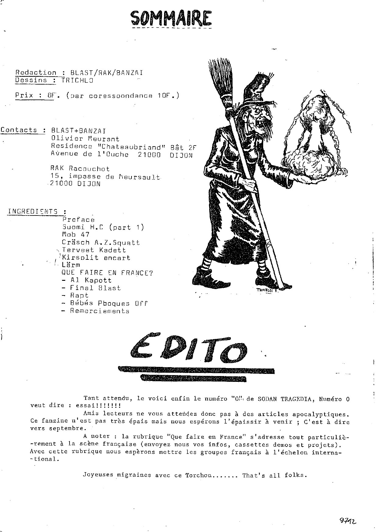 A4 30 pages → Photocopie NB ↪ FR ↪ 21 ↪ Dijon Parution en juin 1985Sodan Tragedia n°0 Numerisation : Oui (150 dpi) En ligne sur Fanzinothèque.fr PLUS MOINS