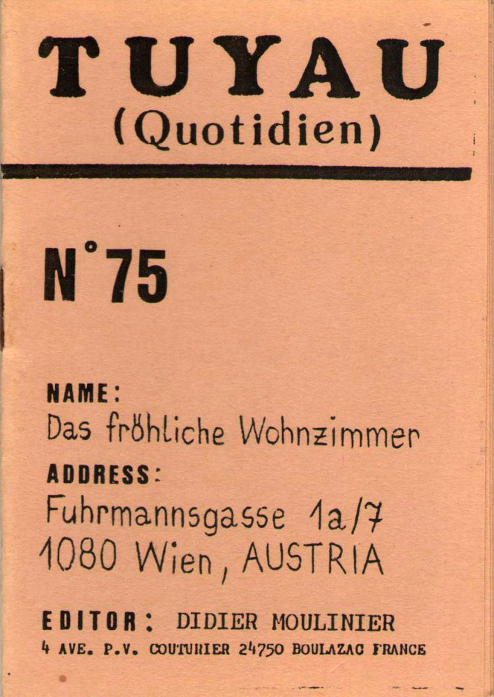 A7 16 pages → Photocopie NB ↪ FR ↪ 24 ↪ Périgueux Parution en mars 1987Tuyau Quotidien n°75-Das Fröhliche Wohnzimmer chez : Moulinier (Didier) Numerisation : Oui (150 dpi) En ligne sur Tape-mag _blank PLUS MOINS