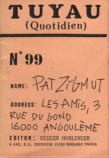 A7 16 pages → Photocopie NB ↪ FR ↪ 24 ↪ Périgueux Parution en mars 1987Tuyau Quotidien n°99 - Pat Zigmut chez : Moulinier (Didier) Numerisation : Oui (150 dpi) Collection privée PLUS MOINS