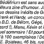 Zine BD et délires en 1984 et 1985 pour 3 numéros en A4 et en provenance d'Angers. Des interviews d'auteurs confirmés (Janin, Edika, Peeters...) et des planches d'auteurs plus ou moins jeunes et plus ou moins reconnus (Bélom, Rouzé...) Et des dédicaces (Margerin, Jano...), ainsi qu'une non interview de Gotlib en cover du dernier n°...