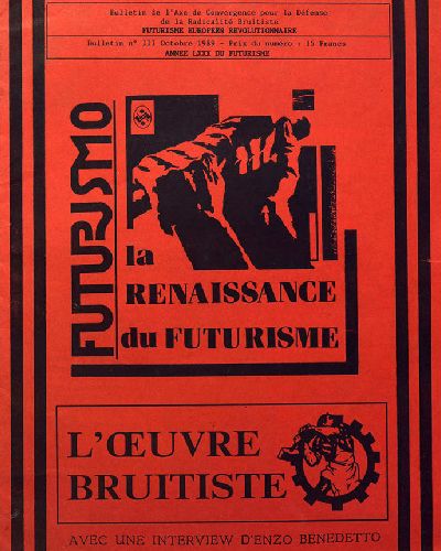 Bulletin de l'axe de convergence pour la défense de la radicalité bruitiste annoncé sur la cover pour le Futurisme Européen Révolutionnaire qui date d'octobre 1989, photocopié A4 surtout textuel mais avec quelques visuels stylés...