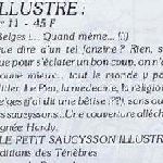 Zine BD Belge (Liège) de 1984 à 1990 en offset qui commence Saucysson Magazine puis devient Le Petit Saucysson illustré, qui passe du format A4 au format A5 en cours de route, 13 numéros en tout. Humour toujours avec la participation de Phil. (Source BD oubliées) En recherche.